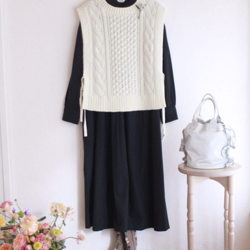 白のベストは春先まで重く見えない強い味方です。 「HEAVENLY ウール混アラン編みベスト 」9,500円(税込 10...