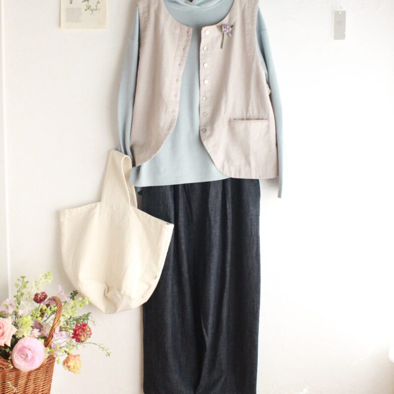 春らしいベストとフード付プルオーバー、 ボトムにデニムを合わせたコーデです。 nachukara コットンリネンキャンバ...