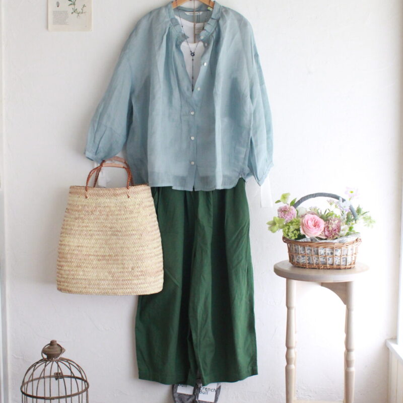 お袖が七分丈くらいの薄手のリネンのブラウスをコーデしました。 シアーリネンタック衿ブラウス 12,800円 (税込 1...