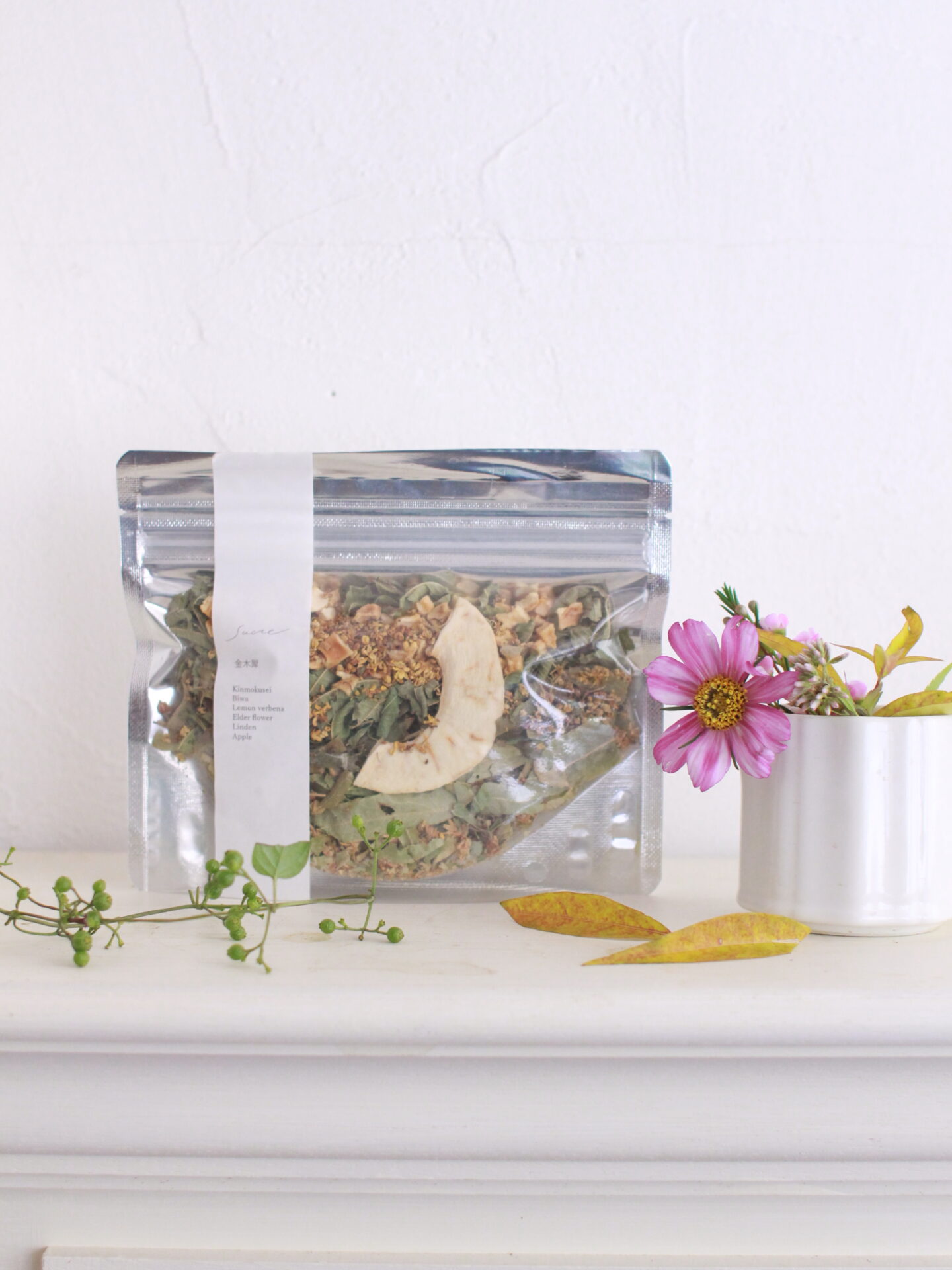 しっとり保湿力を持つハーブが喉や胃腸を守ります。飛騨のクロモジが神経系を調整し巡りを促す芍薬やローズが気分を明るく持ち上げるリラックスティ。