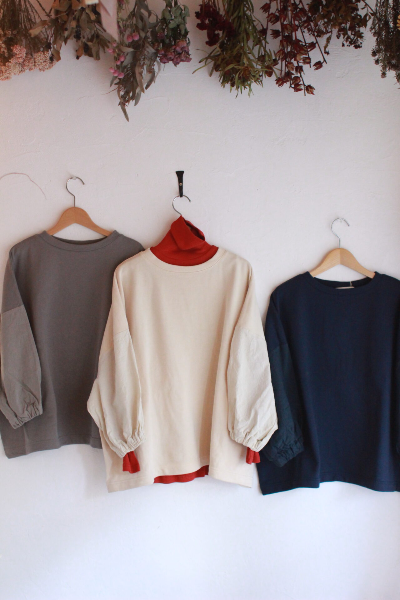 オフショルダーでお袖が布帛で袖口がゴム入りになったトレーナーのご紹介。