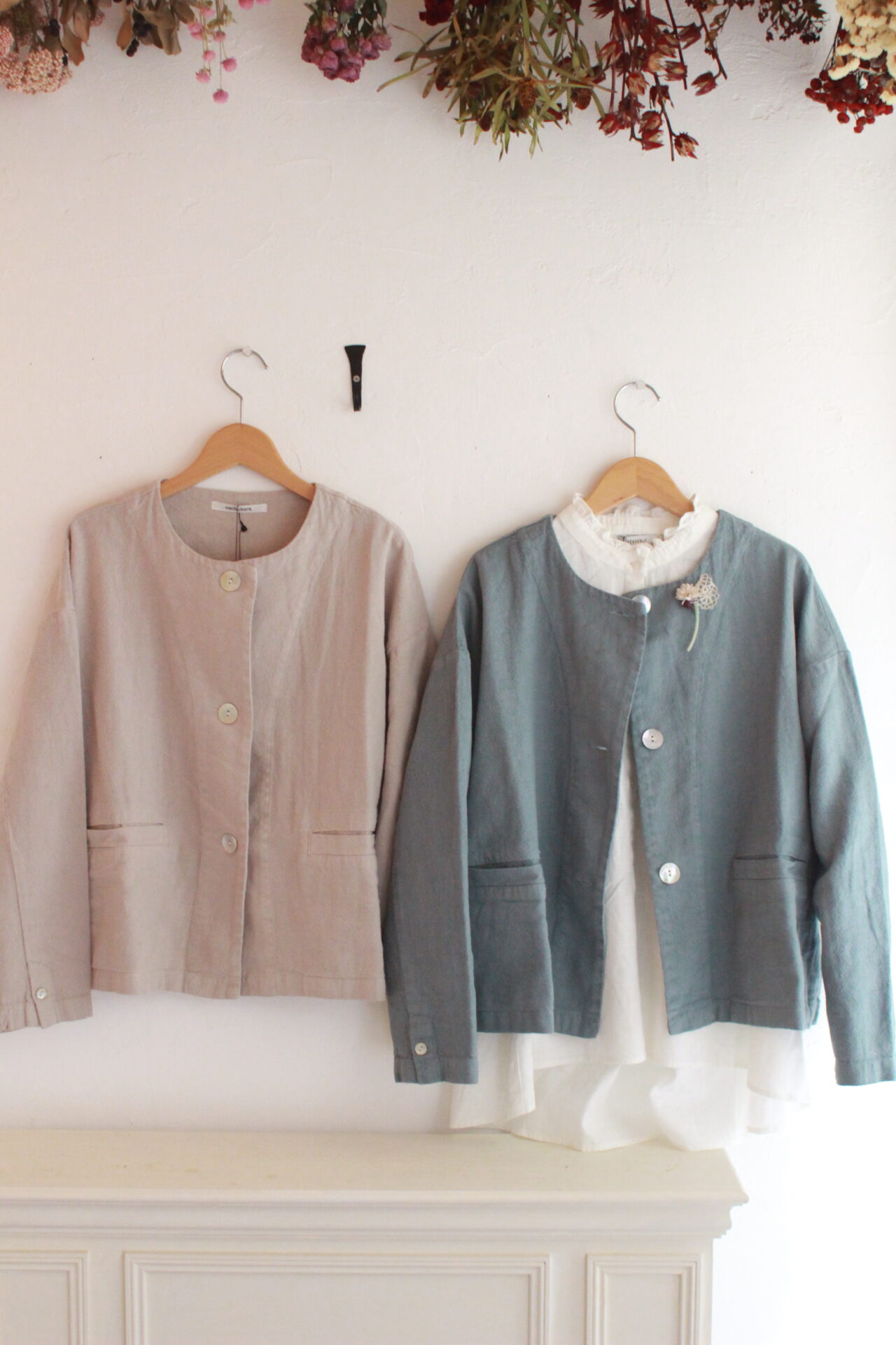 綿麻のざっくりしたジャケットは淡い春色。