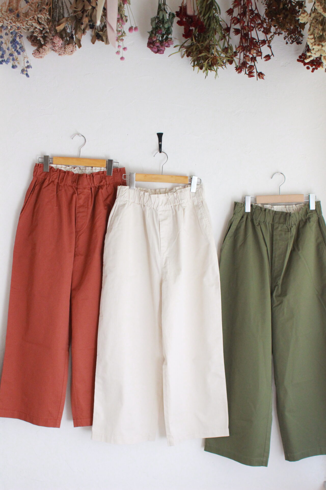 前たてはすっきり見えるフェイクフロント仕様で、ウエストは総ゴムです。リラックス感のあるシルエットながら、脚のラインを拾いにくく、すっきり見えるよう仕上がっています。