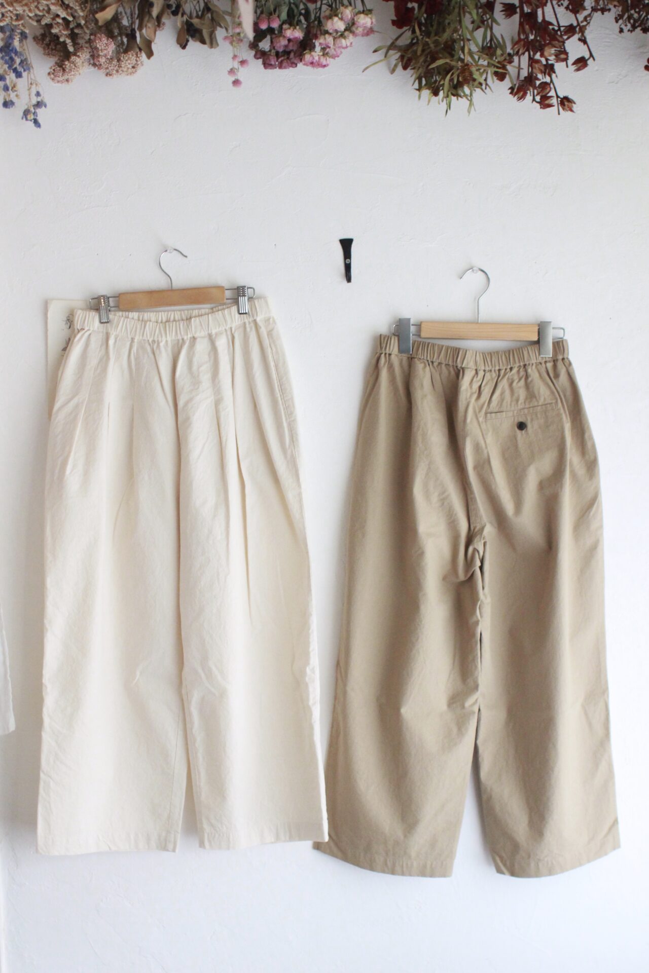 フロントだけタックで抑えた太めのパンツです。